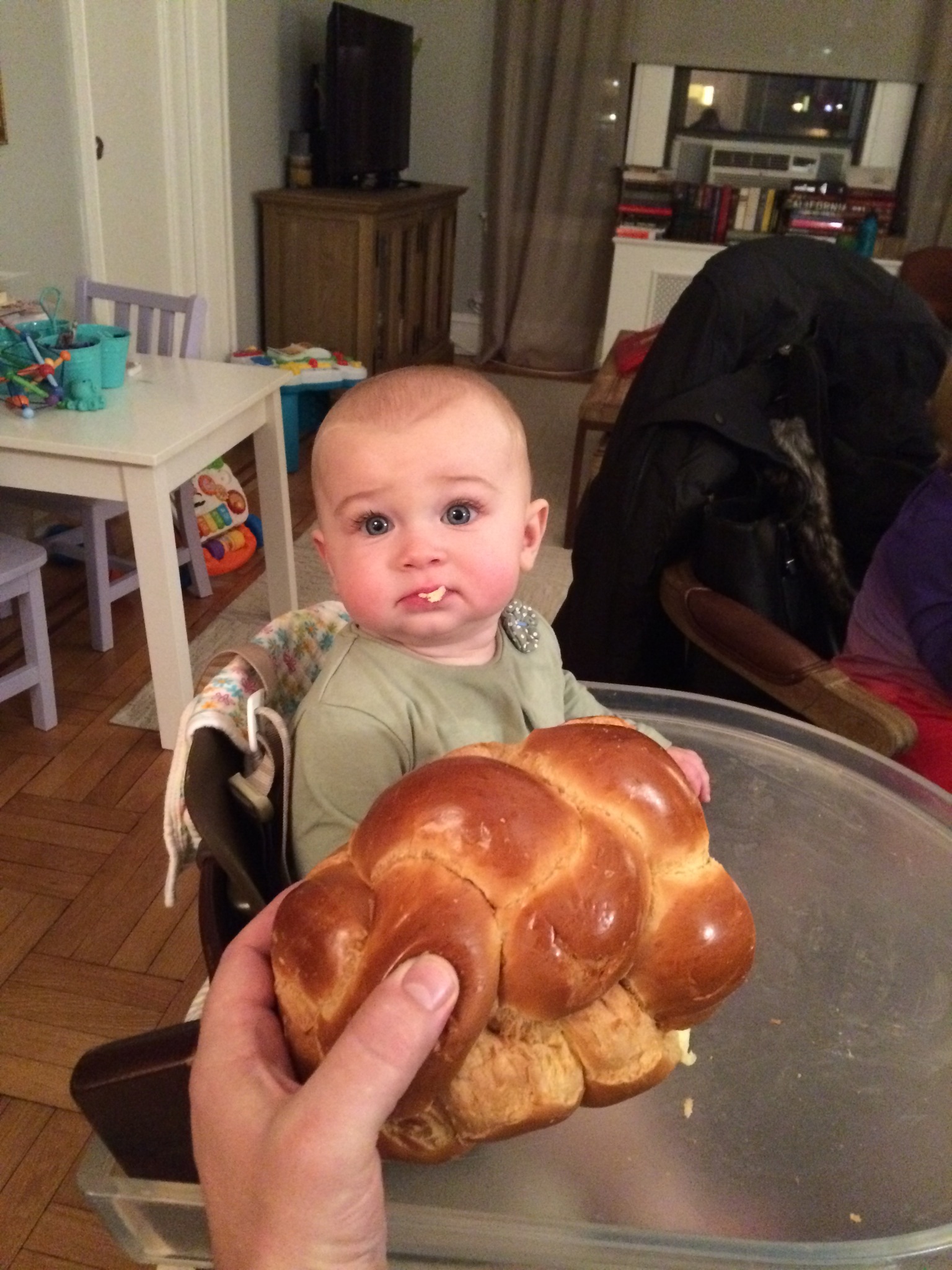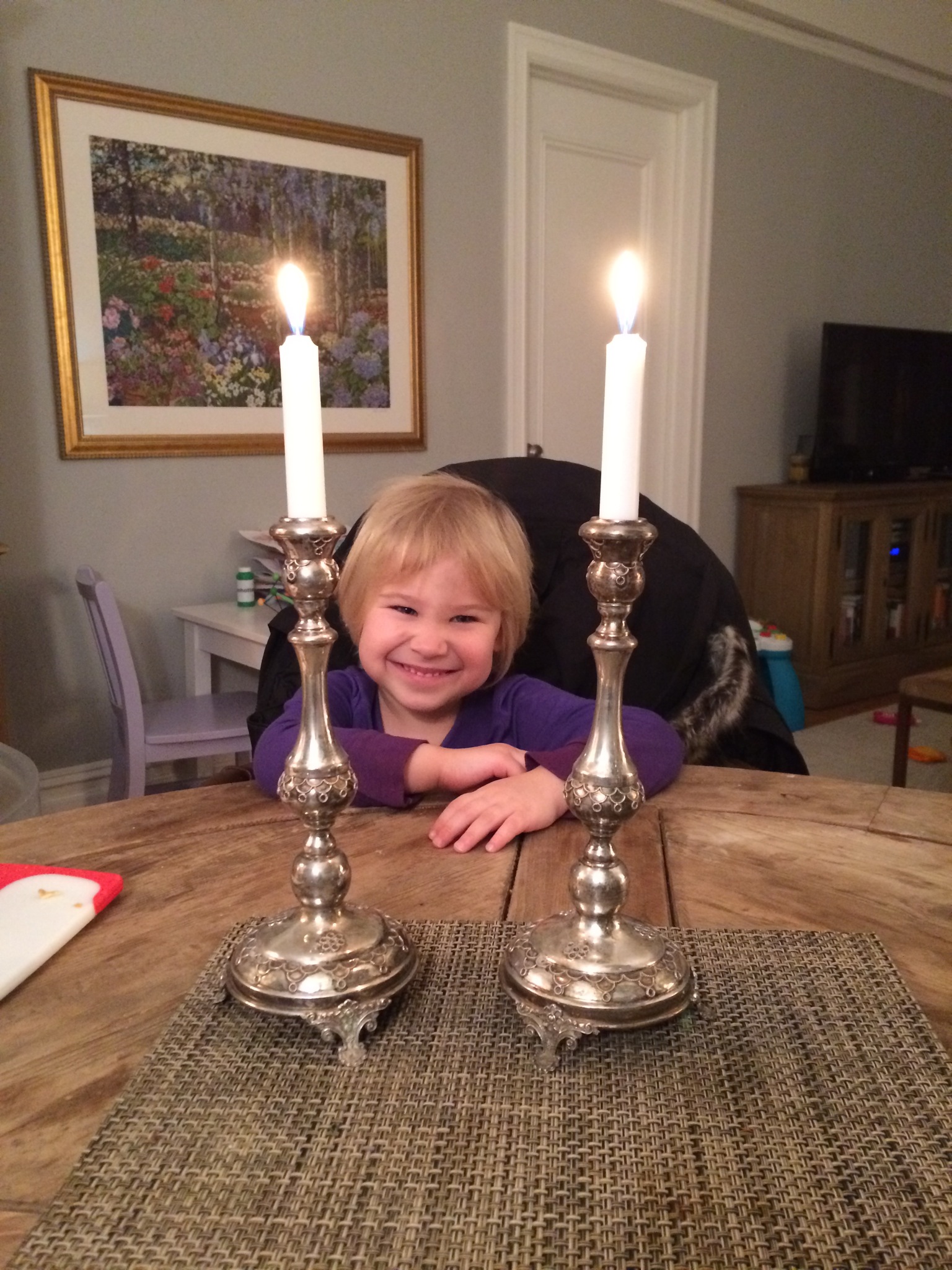 Shabbat shalom – Eliza’s first Challah! And lilia with the candles